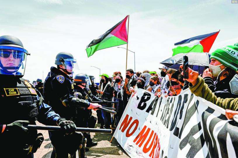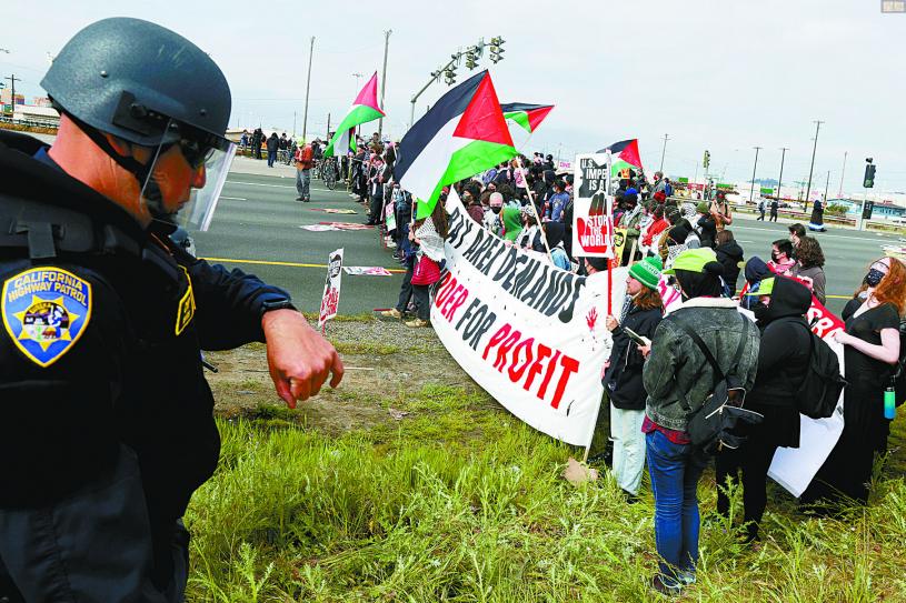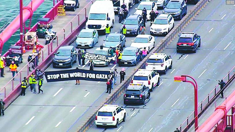 巴勒斯坦的支持者周一(15日)發起全球大示威,在美國和英國等地抗議美國軍援以色列進行加沙戰爭。灣區的示威者早上繁忙時間堵塞兩座重要橋樑和多條高速公路,嚴重干擾民眾生活,數十名示威者遭逮捕,擾攘一個早上後交通才恢復正常。