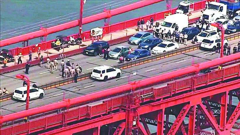 在海灣另一邊,金門大橋也遭受示威者的堵塞,他們拿著兩幅抗議橫幅妨礙交通。