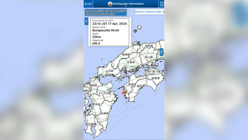 日本南部愛媛縣豐後水道,於當地時間17日晚上11時14分,據報發生6.4 級地震,震源深度50公里,未有觸發海嘯警報。至18日凌晨,日本氣象廳召開記者會,宣布將這次地震由6.4級上調至6.6級,震源深度從50公里更正為39公里。據稱,地震造成數人受傷,幸全屬輕傷,並無造成大型傷亡。