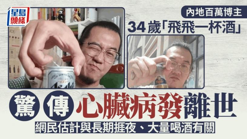 內地知名酒類博主,號稱「喝了幾千款,永遠差一杯」的「飛飛一杯酒(下稱飛飛)」,周三晚突傳死訊。據其訃告指是因心臟病發15日在河南中醫院去年,享年34歲。其妻子亦在網上發文,提醒網民要按時體檢。網民則估計,「飛飛」之逝,與其長捱夜及大量喝酒有關。而其死訊則成為微博熱搜第一名。