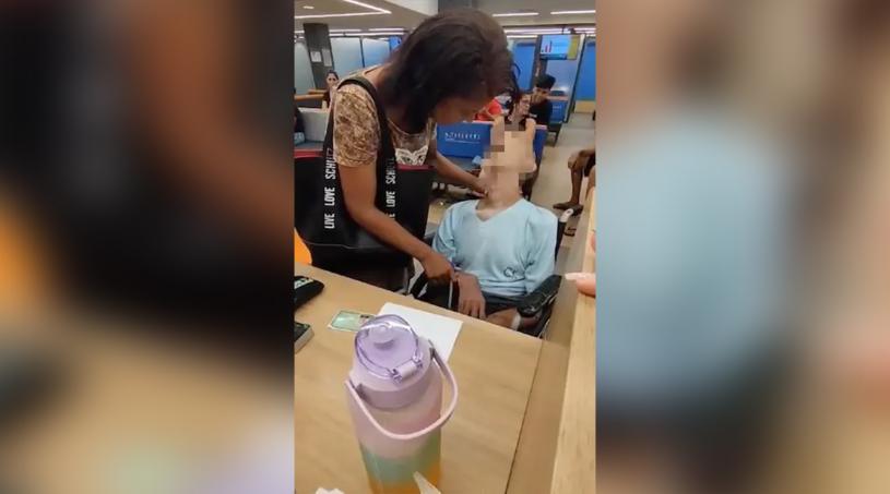 本週一名巴西女子推著一名老人進一間銀行,試圖讓他在一筆$3,400美元的貸款上簽字,但老人一點反應也沒有。影片中,她站在老人旁邊用手扶著他低垂的頭,她對老人說,“叔叔,你在聽嗎?你必須簽字。我不能幫你籤”,然後一邊告訴老人要握住筆,一邊把筆放在了他的手指間,想讓他快點簽名。