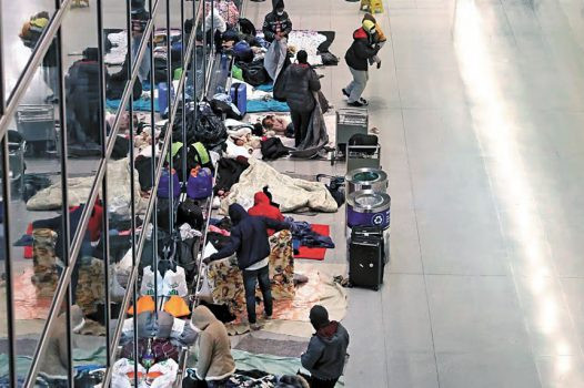 一月份,在州政府為無家可歸家庭開設更多避難所之前,移民們在洛根機場E航站樓過夜。DAVID L. RYAN/GLOBE STAFF