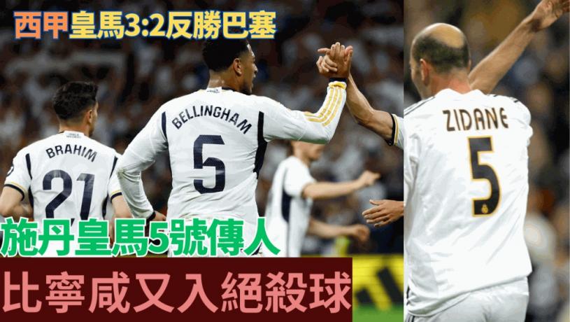 英格蘭國腳中場祖迪比寧咸(Jude Bellingham)今季加盟皇家馬德里後表現光芒四射,被讚揚有名宿施丹(Zinedine Zidane)的影子。周日的西甲次循環國家打吡,比寧咸繼首循環作客魯營球場後,再一次於補時階段射入絕殺球助皇馬主場反勝3:2,個人於國家打吡已累積入3球比肩施丹,賽後被讚成功繼承施丹的皇馬5號球衣。