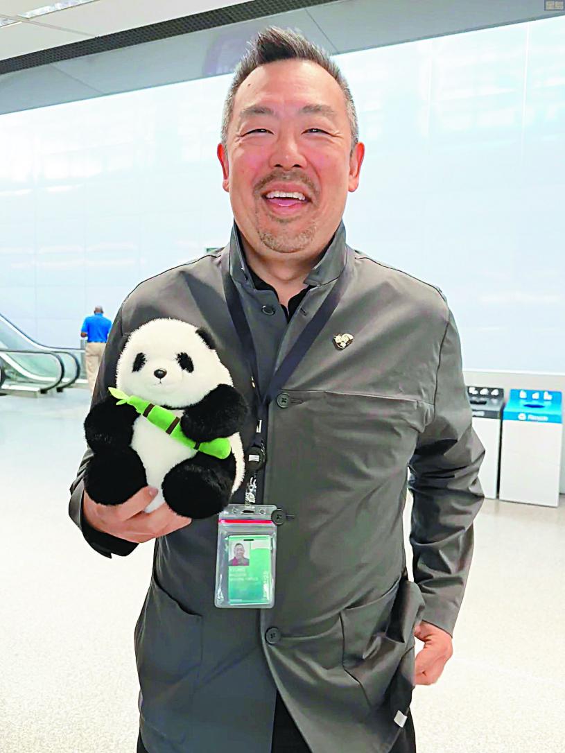布里德市長走出機場時,行李上放著兩個毛絨玩具大熊貓,隨行的市府行政官朱嘉文也手持同樣玩偶。