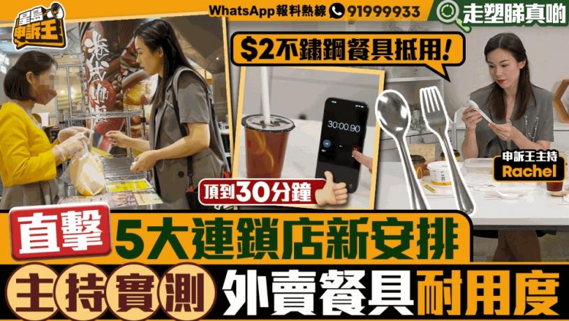 管制即棄塑膠新法例今日生效,食肆開始禁止提供及銷售發泡膠餐具、膠飲管、膠刀叉匙等9類即棄塑膠餐具,堂食同樣要全面走塑,轉用可重用餐具或非塑膠替代品。《星島申訴王》派主持了解市民與食肆開始走塑的準備情況,整合5家連鎖食肆提供外賣餐具之價格、款式資料,並實測其耐用程度。