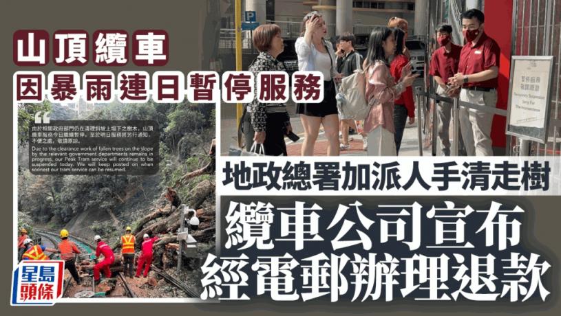 旅遊事務署於昨天(21日)中午接獲山頂纜車有限公司的通知,在天文台發出黃色暴雨警告期間,山頂白加道有大樹倒塌壓著纜車軌,山頂纜車服務暫停。署方隨即與纜車公司及相關政府部門保持緊密聯繫,以掌握事件詳情及善後跟進工作。