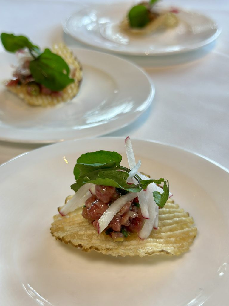 廚師獻禮是一份牛肉撻撻,生的碎牛肉拌著調味放在薯片上,一口不行,要兩口才吃完。這兩口吃出廚師對肉類處理的精心及技巧。