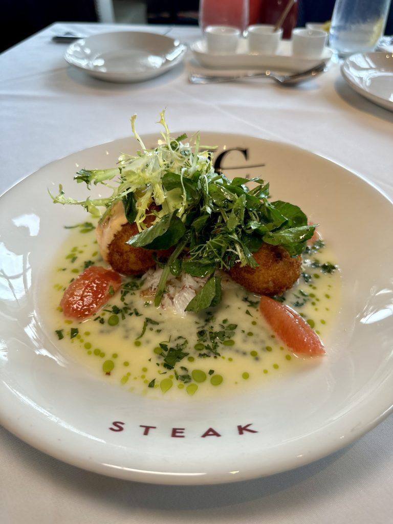 不要以為在這裡就只是牛排好吃。一份煎炸蟹餅吃得我們心花怒放!廚師知道朋友七十生辰,特別藏了大量魚子醬在這道菜中。魚子醬和新鮮的蟹肉一起吃鮮味十足。