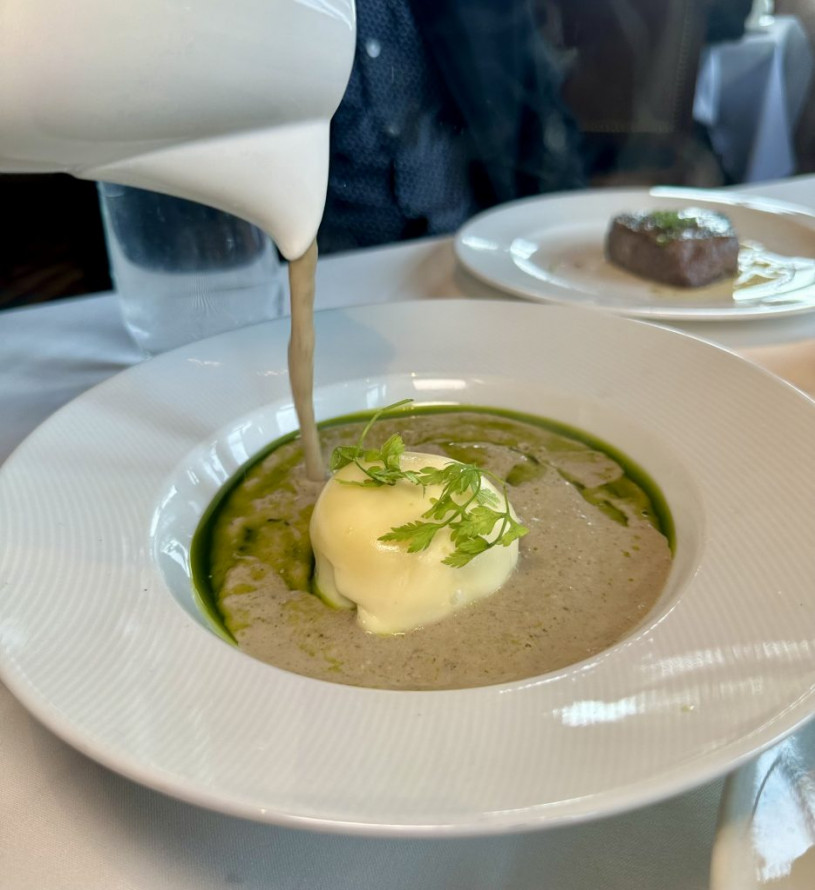 奶油蘑菇湯出場很有動感。服務員先送上盛著一塊烤吐司和芝士的大碗,然後把蘑菇湯注入碗子裡。蘑菇湯很濃稠,配合芝士吃增加口感,而烤吐司吸收滿了蘑菇湯也特別好吃。