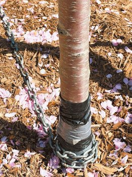 為免被偷,每棵櫻花樹都上了鎖鏈。