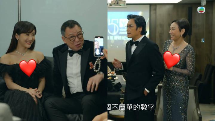 之後劇情一轉來到六個月前,「丘氏集團」的75周年晚宴,當時丘家上下都盛裝出席,吊帶低胸兼露長腿的梁靖琪拍片介紹一家人,向來性感的Dada亦性感低胸上陣。陳瀅同樣以低胸露背出場,一身藍色紗網晚裝,甚有仙氣,而佘討曼則以平口晚裝晒香肩,襯上黑色長手套,高貴又有氣質。現年57歲的前港姐張鳳妮則身穿貼身晚裝,雖然只有坐下的鏡頭,亦見她身材依然凹凸有致。至於最性感的竟然是64歲的余安安,谷胸上陣,大騷3吋事業線,梁靖琪還近鏡拍攝,非常養眼!