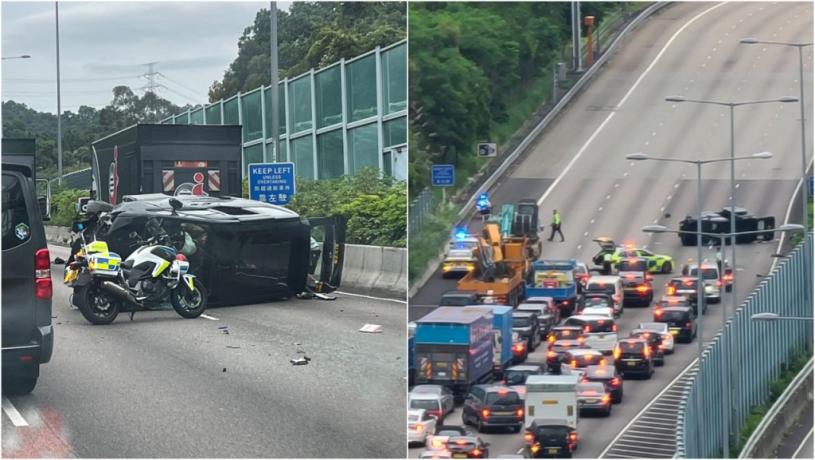 今日(5月18日)下午5時半左右,吐露港公路往上水方向近達運道位置,一部私家車意外翻側,殘骸散落一地,後方司機險些撞上去,所幸及時煞停。車上1小童2成人一度被困,及後獲救,意外原因仍在調查。事故現場清理期間,部份行車線封閉,交通繁忙。