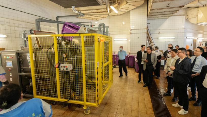 立法會環境事務委員會今日(20日)參觀兩個廚餘處理設施,以加深了解政府回收廚餘的最新措施。議員首先參觀位於大埔墟街市的廚餘預處理系統「廚餘再生俠」的運作。這個由本地研發的系統,已安裝於副食品批發市場、公眾街市、商場和私人屋苑等10個處所。該系統將廚餘轉化為漿液,並儲存於氣味受控的密封儲存缸,再送往政府廚餘處理設施。議員知悉該系統可將上門收集廚餘的頻率減少至每星期一至兩次,從而大幅減低運輸成本。