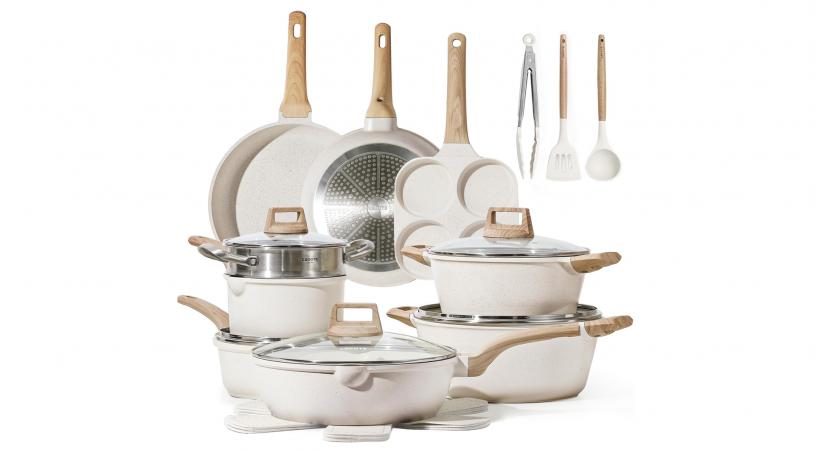 想要一套既美觀又實用的炊具嗎?來看看這款CAROTE 21 件式鍋碗瓢盆套裝吧,白色花崗岩電磁爐不沾鍋,無論是煎、炒、燉都輕鬆應對!這款套裝包含各種常用鍋具:蛋鍋、9.5 吋煎鍋、11 吋煎鍋、1.7 誇脫帶蓋平底鍋和蒸籠、2.4 誇脫帶蓋平底鍋、4.3 誇脫帶蓋砂鍋、6.5 誇脫帶蓋砂鍋、4.5 誇脫帶蓋炒鍋,以及3個餐具和4個平底鍋保護器,滿足你日常烹飪的所有需求。這款炊具採用強化壓鑄鋁結構,堅固耐用,輕便設計讓你的烹飪更加輕鬆愉快。頂級的白色花崗岩材料,具有10倍超不黏性能,不含PFOS和PFOA,確保你的日常烹飪更加安全健康。清潔也非常簡單,只需用紙巾擦拭或用水沖洗即可,大大減少了二氧化碳排放和水浪費。加長底部設計,確保加熱快速均勻,高導磁不銹鋼底座適用於所有爐灶,包括電磁爐。每個CAROTE炊具都經過嚴格的多重檢驗流程,如果收到因運輸造成的有缺陷物品,只需聯繫客服,保證獲得退款或替換品。這款白色花崗岩炊具套裝,無論是性能還是外觀都令人驚嘆,手柄實木質感加上白色花崗岩,非常華麗。熱量分佈均勻,絕對不黏鍋底。
