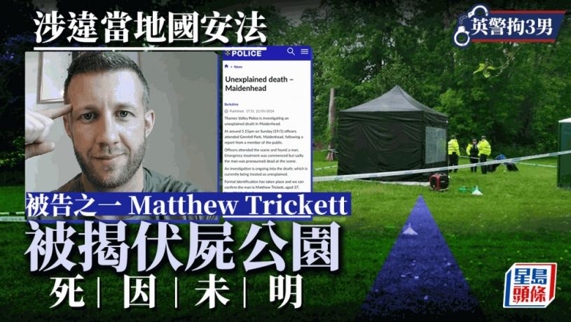 英國警方周二表示,在梅登黑德的格倫菲爾公園發現一具男性屍體,確認死者為37 歲男子Matthew Trickett。英國日前起訴三名男子協助香港情報機關,涉嫌觸犯去年通過的《國家安全法》(National Security Act),Matthew Trickett是其中一人。