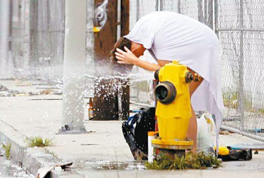 一名無家可歸婦女在洛市中心遊民營地附近的消防栓洗澡。洛杉磯時報