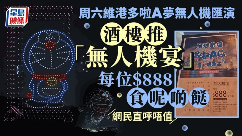 全球首場「多啦A夢」無人機匯演將於本周六(25日)晚於尖沙嘴星光大道一帶海濱上演,為7月舉行的「100%多啦A夢&FRIENDS」巡迴特展預熱。有酒樓趁機推出價值888元的「無人機宴」吸引市民消費。