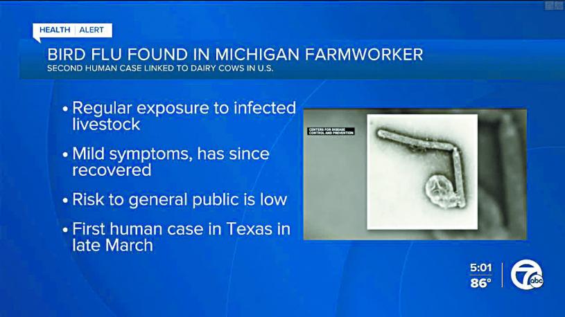 全美出現第2宗牛隻感染禽流感後再傳至人類的個案,密歇根州官員證實,當地有農場工人因此感染H5N1病毒,但發病期間只有輕微症狀,目前也已完全康復,政府為了保護農場及工人私隱,因此不能提供更多細節。