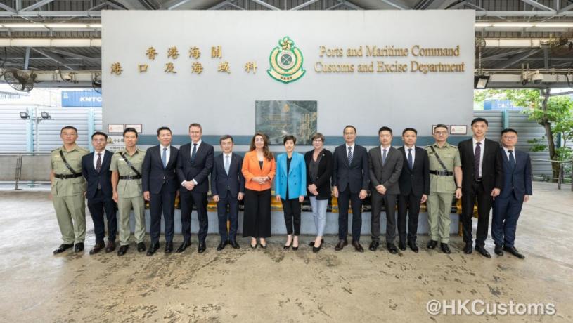 海關關長何珮珊今日(23日)與助理關長賴子榮,陪同聯合國毒品和犯罪問題辦公室主席加達•法特希•瓦利(Ghada Fathi Waly)率領的代表團,參觀葵涌海關大樓。