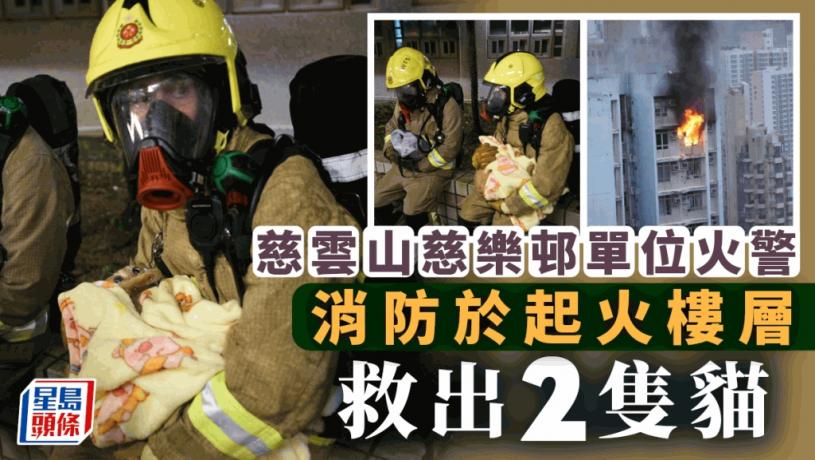 消防員在起火樓層救出兩貓。尹敬堂攝