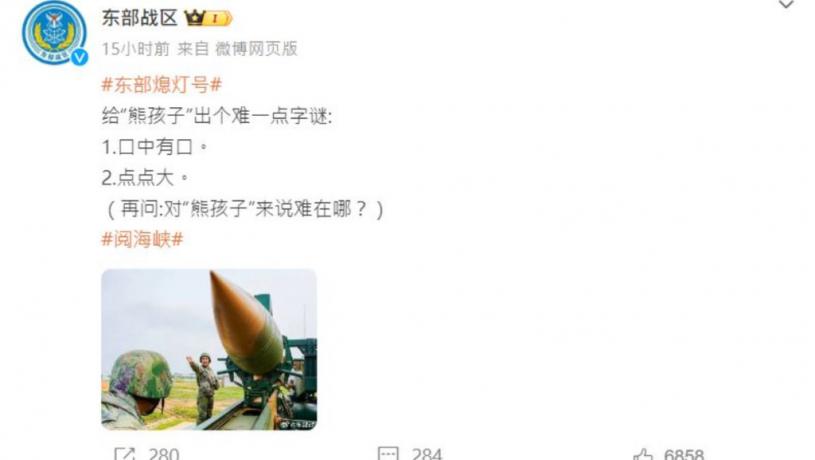 解放軍東部戰區在上周四(23日)及五舉行圍島軍演,展示「殺獨」能力後,於昨晚(26日)深夜發文,以猜字謎方式,警告台灣「回頭是岸」。