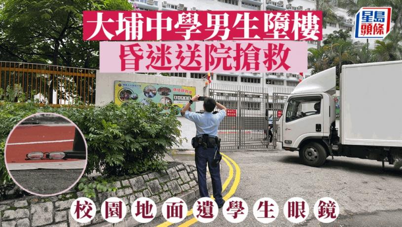 今日(27日)中午12時許,一名男學生在大埔翠怡街佛教大光慈航中學墮樓。救護員接報趕到,發現男學生昏迷,隨即將他送往沙田威爾斯親王醫院救治,可惜最終回天乏術。現場地面留下一副眼鏡,警方在校內調查,現場沒有檢獲遺書,相信男生由學校頂樓一課室墮下,正了解事故原因。