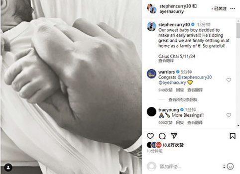 據悉,凱厄斯是在5月11日出生的,是庫里的第四個孩子,也是庫里家族年齡最小的成員。勇士的官方帳號、球員,以及包括特雷.楊在內的一些NBA球星第一時間送上祝福。