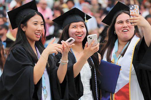 Kayla Pham、Kathy Xu和Richelle Barry在馬薩諸塞大學波士頓分校的畢業典禮上為一位走上講台的朋友歡呼。 LANE TURNER/GLOBE STAFF