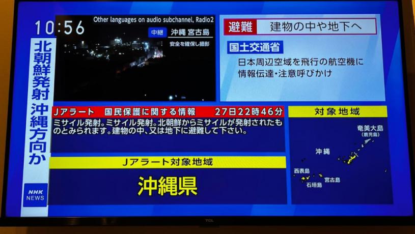 日本放送協會(NHK)報道,日本政府透過「全國瞬時警報系統」(J-Alert)表示,北韓疑似發射一枚導彈。當局隨即向沖繩發緊急警報。