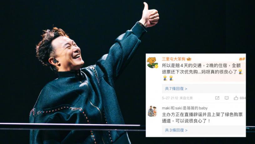 有一名叫「熱愛小魚和漣漪」歌迷更在網上發文,「你的意思是我們應該昨天聽到延期立刻連夜回家而不是再住一宿嗎?我們本來就有兩場票的難道不能定兩宿住宿嗎?你是覺得我們該昨夜回北方明天再飛過來嗎?」甚至有網友直留言:「12315(消費者投訴舉報熱線)見吧。」
