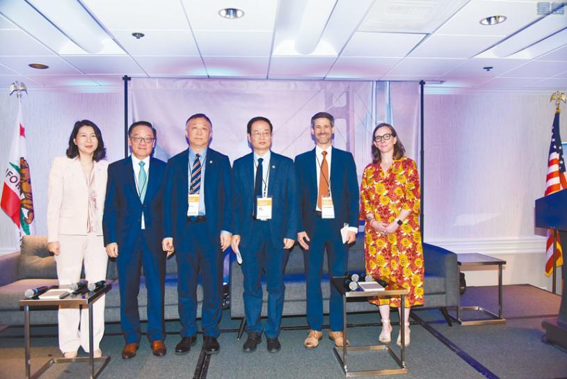 來自廣州、香港、澳門及深圳等地的中國代表,與加州本地環境與經濟官員舉行三組討論會,由加州-中國氣候研究院主任戴凡主持,首場討論會主題「共建綠色低碳灣區」,出席者包括加州環保署署長加西亞(Yana Garcia)、交通署署長奧米莎金(Toks Omishakin)、深圳建築科學研究院股份有限公司董事長葉青、廣東省生態環境廳廳長徐曉霞、香港財政司司長陳茂波、澳門科技大學校長李行偉。