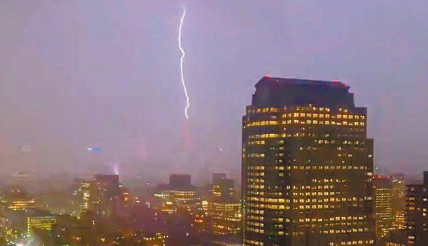 當29日晚上雷暴侵襲曼哈頓時,有人拍下閃電擊中帝國大廈和世貿中心一號大樓的瞬間。