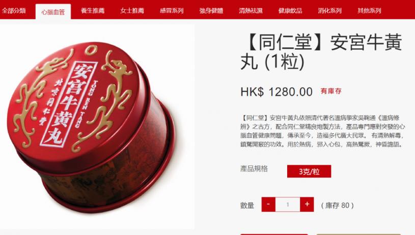 據北京國藥有限公司官網顯示,港版安宮牛黃丸價格出現大幅上漲,一粒裝價格1280港元。比起此前,港版北京同仁堂安宮牛黃丸一粒價格1060港元,高出了220港元,加價幅度超過20%。同仁堂證券部工作人員稱,港版安宮牛黃丸主要面向海外客群銷售,近期確實加了價。