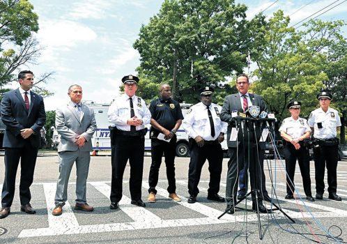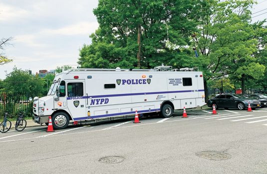紐約市警轄區皇后北區指揮中心的流動指揮中心車在公園外設立,協調警方多部門對案件的偵辦工作。