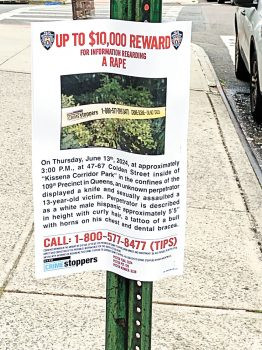 紐約警察局宣布懸賞10,000美元通緝涉嫌在法拉盛凱走廊公園強姦13歲女童的一名西班牙裔男子。