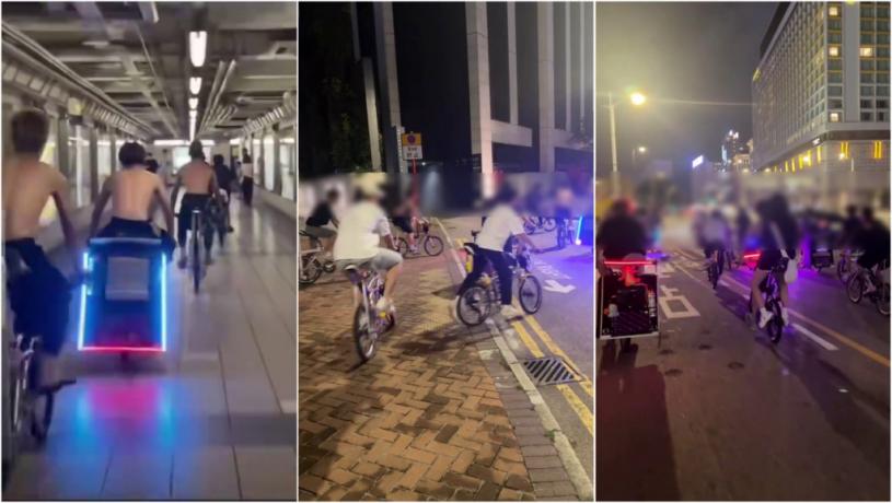 網上今日(6月15日)流傳數則片段,確實拍攝時間未明。內容為一批少年單車「暴走族」,於尖沙咀海濱及紅磡站一帶出沒。他們不少人都赤膊上身,沒有佩戴頭盔等保護裝置,單車上亦掛了燈條和音箱等,部份人甚至載了少女乘客。他們除了在紅磡站行人隧道內風馳電掣外,也踩出了尖沙咀梳士巴利道馬路上,不但危及自身安全,也威脅其他行人及駕駛者。