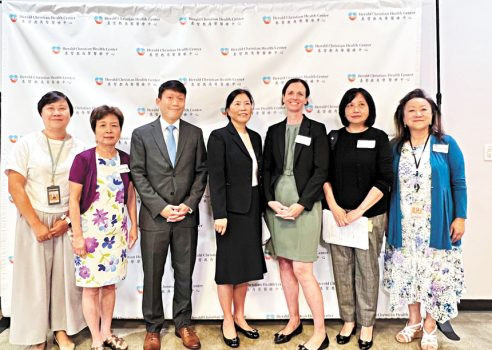 左起為:基督教角聲醫療中心品質監控總監李家宜、執行總監吳周秀蘭,美國證券交易委員會洛杉磯地區辦事處的稽查部聯席主管 Gary Leung、稽查部資深律師馬俊陵、區域總監 Katharine Zoladz、稽查部助理總監張曉雲、基督教角聲醫療中心行政總監司徒秀慧。