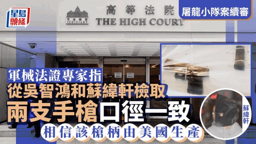 屠龍小隊等人涉串謀在遊行中設置炸彈案第36天審訊。控方今傳召軍械法證專家,他供稱兩支從吳智鴻和蘇緯軒檢取的手槍上寫有「P80」,兩者口徑一致,外貌相似,另相信「P80」的槍柄由美國生產。