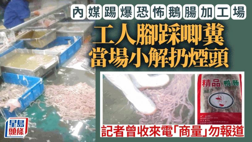 口感脆、味道鮮的鴨腸和鵝腸,常常佔據著火鍋店「熱銷榜」前列,但是內地媒體《新京報》卻揭發山東濱州、河南清豐兩間禽類屠宰加工廠髒亂衛生問題嚴重,令人擔憂,包括屠宰廠工人用腳踩鵝腸擠糞、排水口小便後撈出死鴨子送廠、煙頭扔進鴨腸筐、鴨腸撈出死蒼蠅、用紅水替鵝腸染色賣火鍋店。該報記者聯繫兩地多個監管部門後,更收到涉事企業電話稱影響銷路,要求商量別曝光事件。河南清豐縣市監局6月17日表示,涉事企業已停產整頓,相關責任人已被控制。