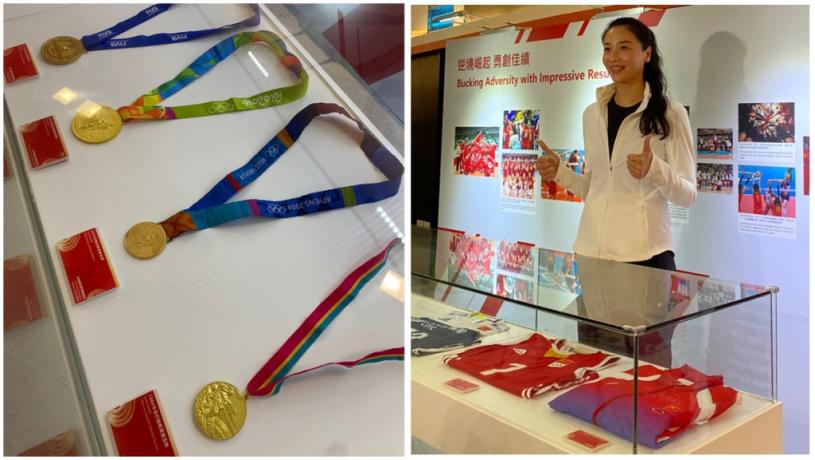 展覽展出中國女排所獲得的獎杯,獎牌,冠軍比賽隊服及球鞋等物品。翁嘉琳攝