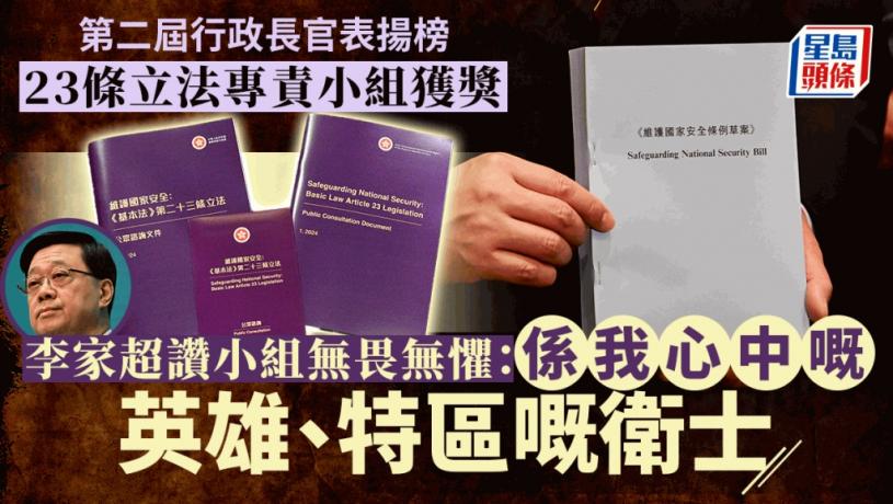 行政長官李家超今日(18日)出席行會前見記者,公布今年「行政長官表揚榜」的得獎者為《基本法》第二十三條立法專責小組,成員包括律政司、保安局及警務處。