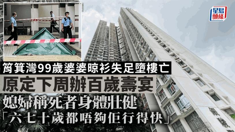 筲箕灣一名99歲姓陳婆婆在寓所內晾衫時疑失重心墮樓,傷重不治。據家人表示,陳婆婆身體健壯,平日早上會行山晨運,又會煲補湯及食保健品養生,下周更100歲生日,家人準備替她舉辦百歲宴慶祝生日,詎料今日發生慘劇,「佢年紀大要走都唔係問題,但點解會咁樣走,我哋都好無奈,真係好難過,佢應該係好風光㗎嘛」。