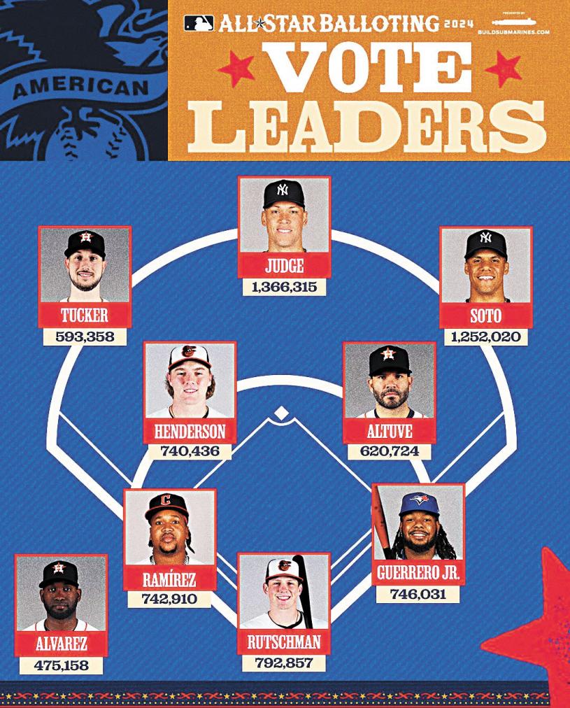 2024年全明星賽第一波投票結果出爐,揚基的兩名外野手「法官」賈吉和索托分別以136萬票和125萬票,暫居美聯榜首和次席。轉為一壘手的費城人哈波以111萬票領先國聯球星,道奇日籍球星大谷翔平獲得1002377票,在DH(指定打擊)位置一枝獨秀,該位置第2名的勇士歐蘇納只有47萬票。
