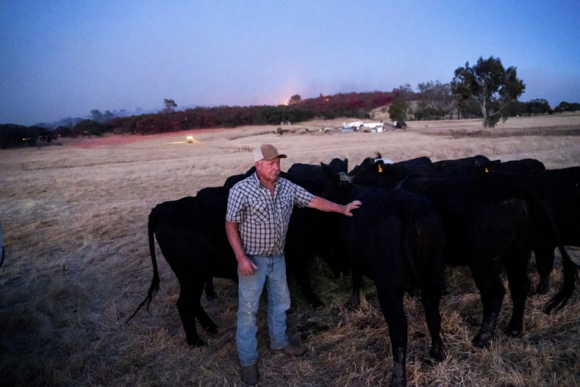 山火附近的農民安撫牛群。美聯社