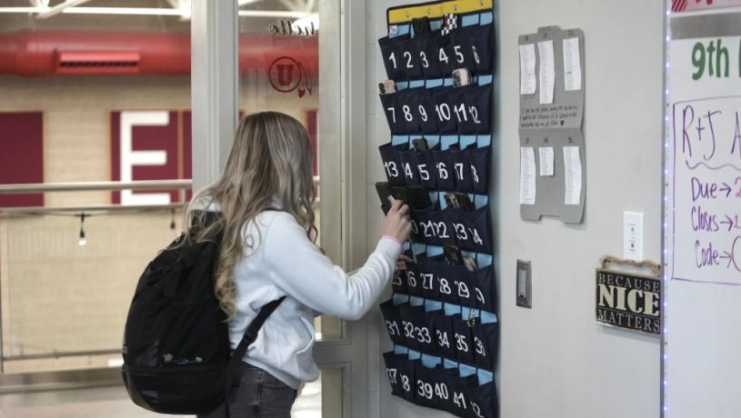 猶他州一間學校學生上課前寄存手機。 美聯社