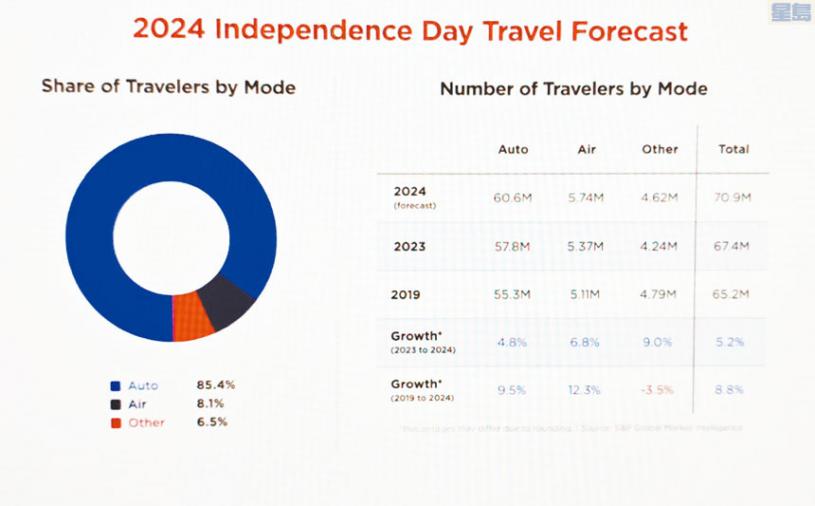 AAA預測獨立日這一周駕車出行人數將達到創紀錄的6060萬人,比去年同期增加280萬人,這一數字也將高於2019年駕車出行的5530萬人。AAA汽車租賃夥伴赫茲(Hertz)稱,在獨立日這一周期,達拉斯、丹佛、鹽湖城、洛杉磯及三藩市的租車需求最高。