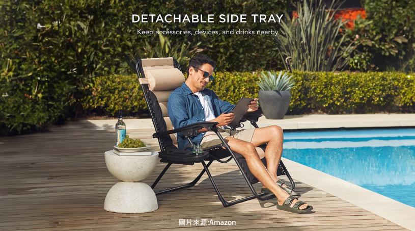 除了舒適之外,這款椅子的便攜性也是一大亮點。輕巧的摺疊設計讓你可以輕鬆攜帶,無論是在家中、海灘、公園還是野餐,都能輕鬆享受這份舒適。它還包括一個可拆卸的側托盤,配有兩個杯架、一個手機支架和一個平板電腦支架,讓你最喜歡的設備觸手可及,不用擔心找不到地方放置飲品或電子設備。最棒的是,這款椅子還配有可鎖定的傾斜系統。超寬座椅可以平穩滑入符合人體工學的零重力位置,並配有鎖定系統和鬆緊帶提供額外支撐,讓你找到最舒適的角度,徹底放鬆自己。