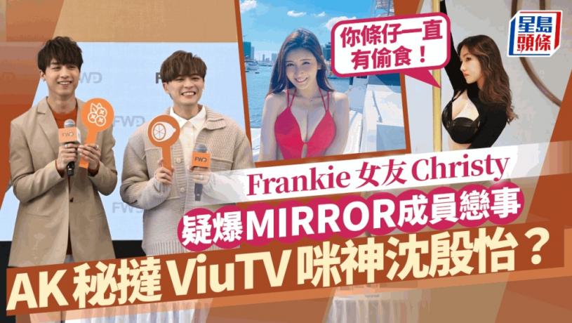男團MIRROR的成員陳瑞輝Frankie(皮皮)最近爆出新戀情,女友Christy瘋狂自爆,引來不少網民討論,連經理人花姐都疑似Po燒雞照暗寸Christy的博出位行徑。今日(10日) 再有疑似Christy的IG密友限時動態的截圖於網上瘋傳,疑似驚爆AK(Anson Kong江𤒹生)曾與ViuTV咪神沈殷怡秘密拍拖。