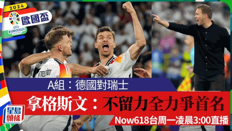 歐國盃主辦國德國於A組兩戰全勝提早奪得出線席位,今晚尾輪對瑞士勝負只會影響首、次名排序。而A組首名出線會留在上線,對手有西班牙和葡萄牙,外界猜測德國會否刻意輸波走線。日耳曼軍教練拿格斯文賽前強調必定全力以赴爭取勝利,確保小組首名晉級。隊長根度簡亦指難得全國人民支持,無論如何都要延續勝利勢頭。