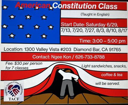 在11月大選來臨之前,為幫助華人新移民更瞭解美國政治和法律,非營利組織「社區安全人人有責」協會(簡稱TACF)從本月底開始,邀請橙縣學者拉裏·麥克米倫(Larry McMillan)開講美國憲法課程,旨在幫助民眾增強公民意識、瞭解公權力和私權力如何平衡,以及如何保障自己的利益,維護公平正義。